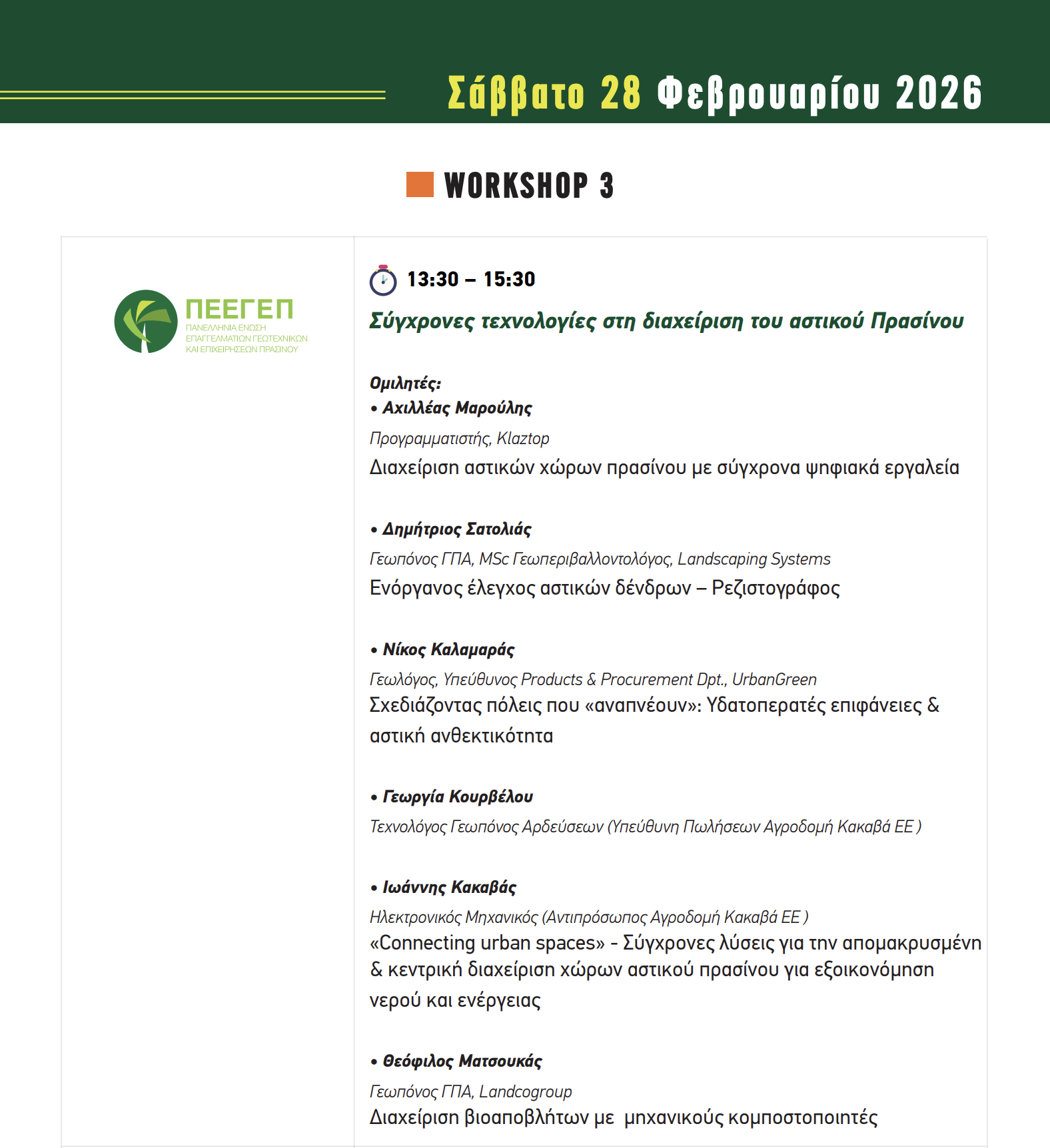 Η Πανελλήνια Ένωση Επαγγελματιών Γεωτεχνικών και Επιχειρήσεων Πρασίνου – ΠΕΕΓΕΠ διοργανώνει στο πλαίσιο του Verde.Tec Forum 2026 την εκδήλωση «Σύγχρονες τεχνολογίες στη διαχείριση του αστικού Πρασίνου» η οποία θα πραγματοποιηθεί το Σάββατο 28 Φεβρουαρίου 2026, στις 13:30 – 15:30, στην αίθουσα Workshop 3 στο εκθεσιακό κέντρο MEC στην Παιανία.