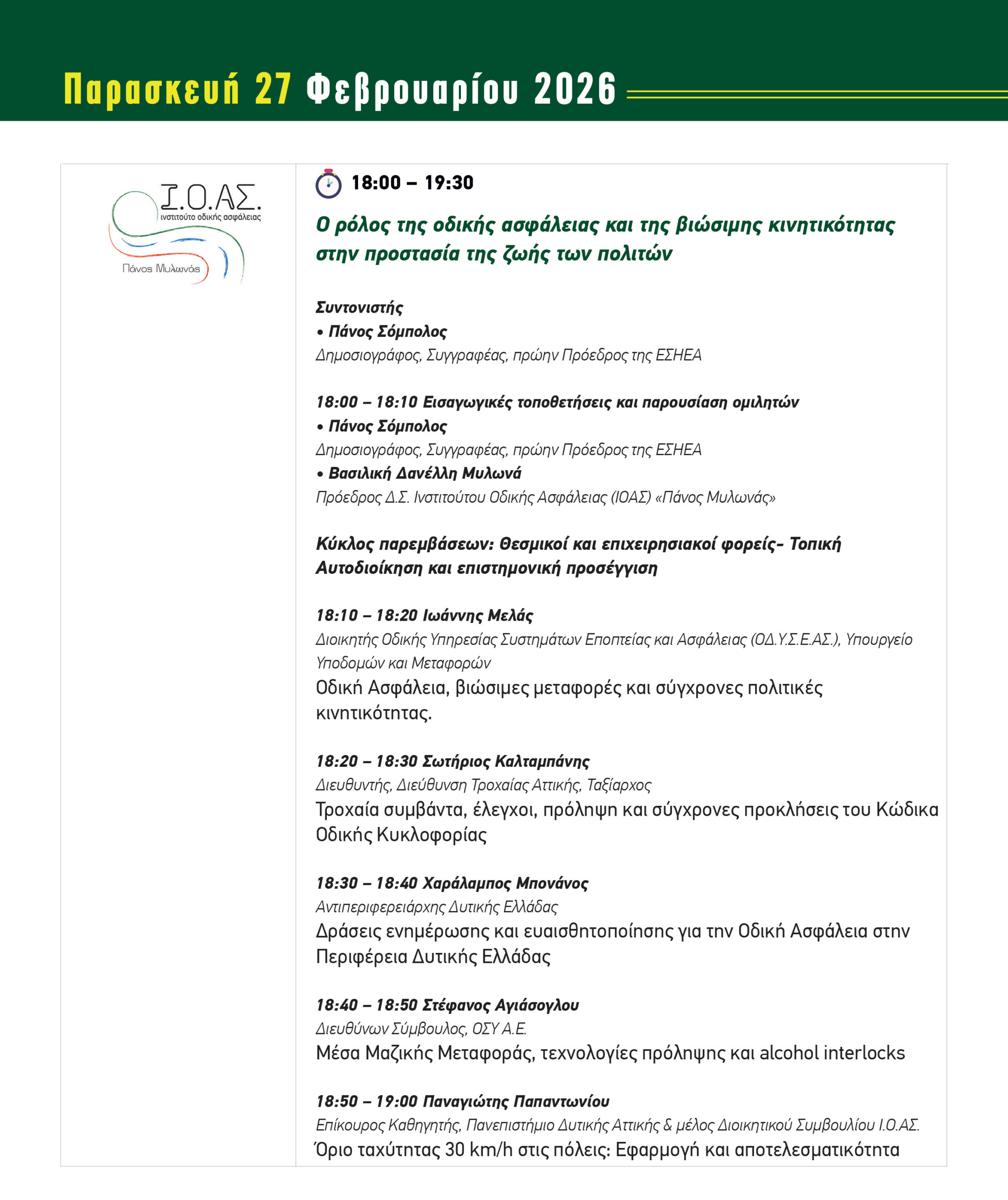 Το ΙΝΣΤΙΤΟΥΤΟ ΟΔΙΚΗΣ ΑΣΦΑΛΕΙΑΣ (Ι.Ο.ΑΣ.) «ΠΑΝΟΣ ΜΥΛΩΝΑΣ» διοργανώνει στο πλαίσιο του Verde.Tec Forum 2026 την εκδήλωση «Ο ρόλος της οδικής ασφάλειας και της βιώσιμης κινητικότητας στην προστασία της ζωής των πολιτών» η οποία θα πραγματοποιηθεί την Παρασκευή 27 Φεβρουαρίου 2026, στις 18:00 – 19:30, στην αίθουσα Workshop 2 στο εκθεσιακό κέντρο MEC στην Παιανία.