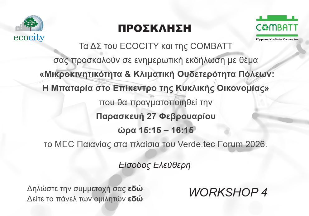 Στο πλαίσιο της συμμετοχής μας στη Verde Tec 2026, η COMBATT και το ECOCITY διοργανώνουν ειδική θεματική εκδήλωση με τίτλο «Μικροκινητικότητα & Κλιματική Ουδετερότητα Πόλεων: Η Μπαταρία στο Επίκεντρο της Κυκλικής Οικονομίας», η οποία θα πραγματοποιηθεί την Παρασκευή 27 Φεβρουαρίου 2026, ώρα 15:15 – 16:15, στην αίθουσα Workshop 4, στο Εκθεσιακό Κέντρο MEC στην Παιανία.